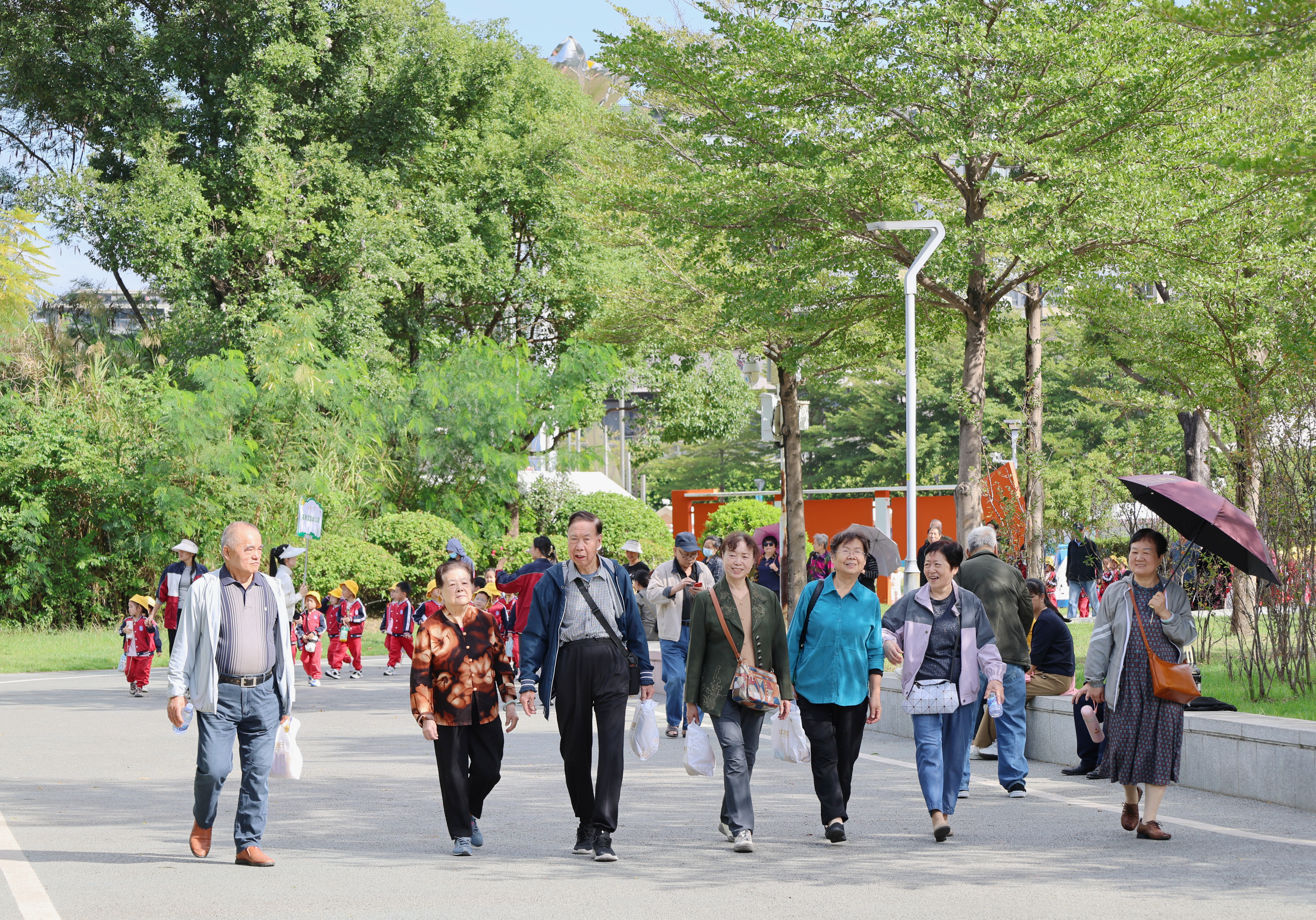 清晨的飞凤山奥体公园,风清气爽,景色宜人。老同志们兴致盎然,在工作人员的陪伴下,漫步于平坦的景观步道,沐浴着和煦的阳光,欣赏金秋山色。大家时而驻足赏景,时而合影留念,欢声笑语在山间回荡。漫步结束后,大家来到公园的休息区小憩。没有了正式会议的拘束,老友们三三两两,轻松自然地闲话家常,共叙情谊。校领导也来到老同志们中间,与他们亲切交谈,关切地询问他们的身体和生活状况,并代表学校送上诚挚的节日祝福与问候,现场气氛温馨而热烈。
